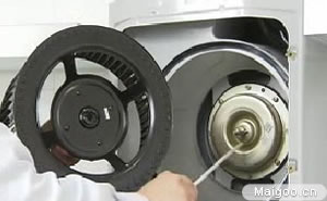 6、重點出來了——油煙機的葉輪,就是這個黑乎乎的圓圈,如果臟了纏上了厚厚的一層油的話,葉輪的轉(zhuǎn)速就會變慢,直接導(dǎo)致油煙機工作的吸力變?nèi)酢K匀~輪是清洗油煙機時的重點之一。